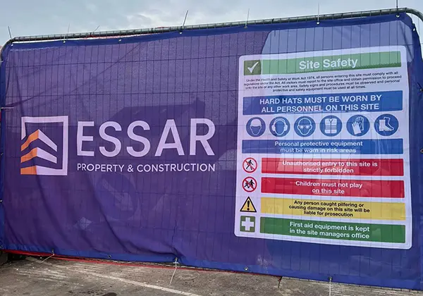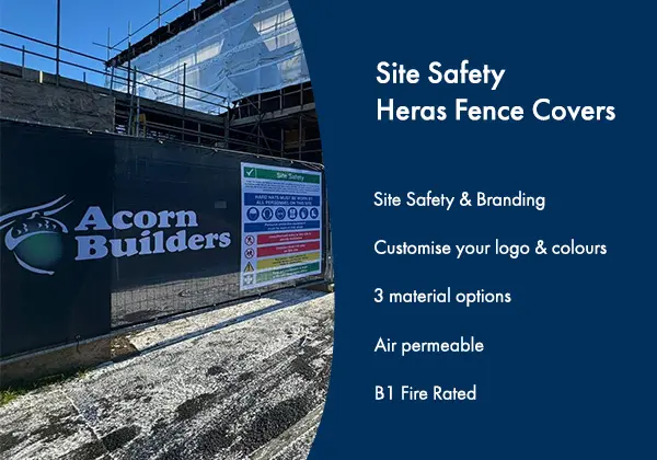 Keep your site safe, professional and private with branded site safety Heras fence covers. Site safety signage printed alongside your logo, contact details and brand colours. Available in 3 air permeable materials and B1 Fire Rated. Get an instant quote using the price calculator below.