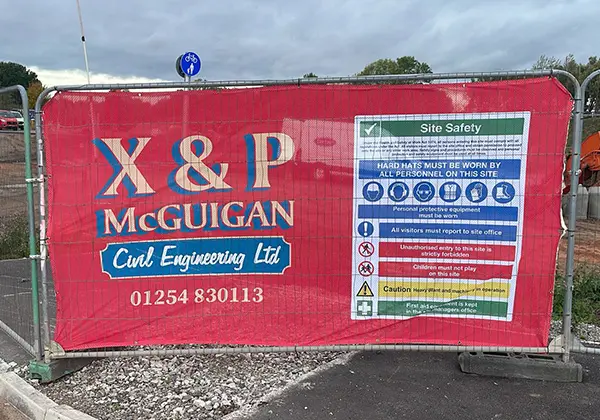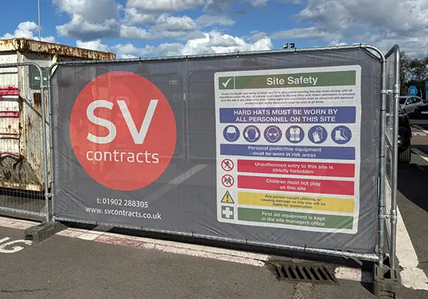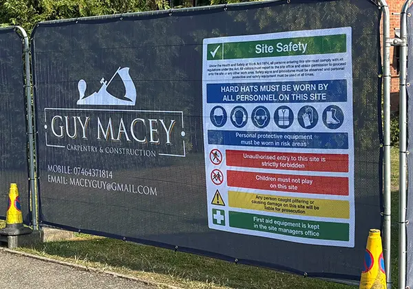 Each cover includes a general site safety rules sign as standard (as shown in the product images) printed alongside your logo, contact details and brand colours.